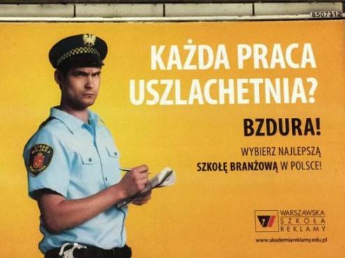 Dla wzmocnienia efektu Warszawska Szkoła Reklamy do tego miksu dorzuciła jeszcze domniemaną prostytutkę, bo, jak dobrze wiadomo, żarty z kobiet zmuszonych przez sytuację życiową do sprzedawania swojego ciała śmieszą od zarania dziejów. Za każdym razem gdy spojrzę na tę reklamę, w głowie słyszę nieśmiertelne: „Czy można zgwałcić prostytutkę? Hehe hehe hehe”. Obok zdjęcia wypiętej, mocno umalowanej, ale za to ledwie ubranej dziewczyny możemy przeczytać: „Żadna praca nie hańbi? Bzdura!”. Otóż tu twórcy kampanii zdecydowanie się mylą. Być może czas najwyższy, by ktoś uświadomił im, że dość hańbiące jest wykorzystywanie w swojej pracy tzw. „szczucia cycem” połączone z podśmiechujkami z dramatu milionów kobiet na całym świecie.