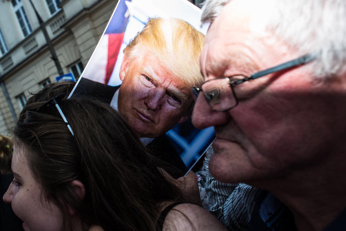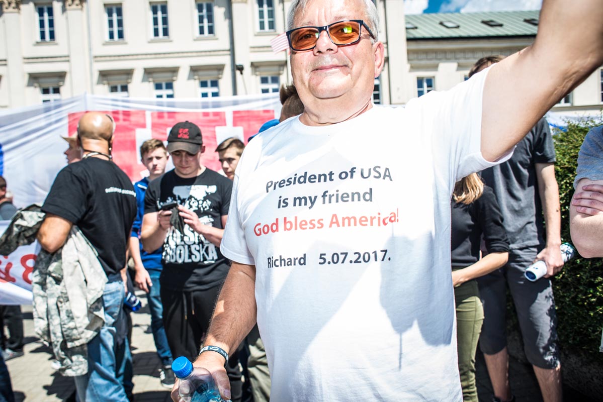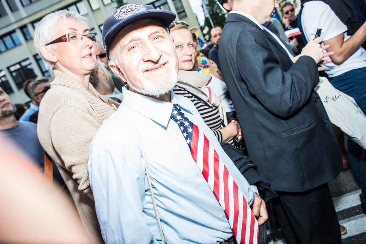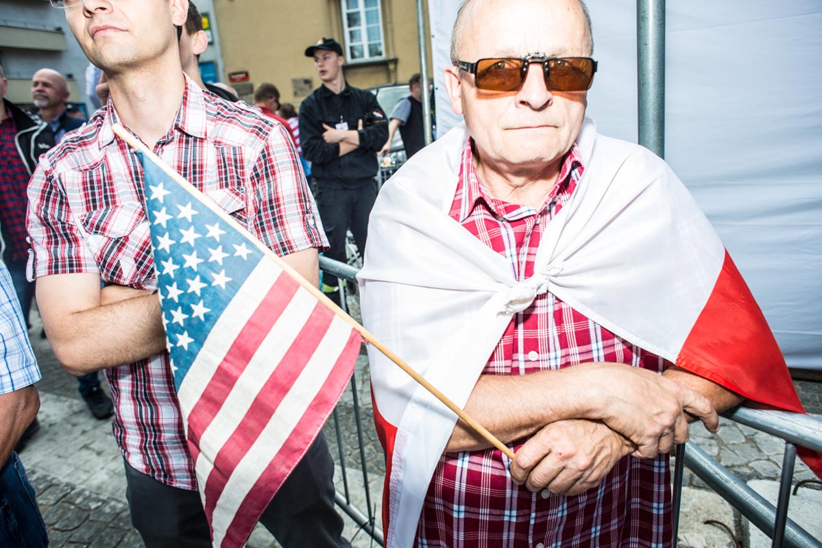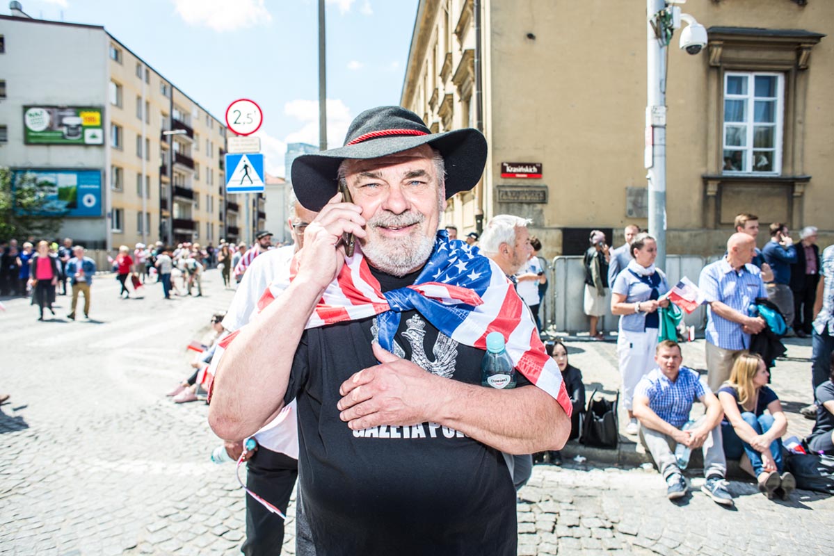 Chociaż tego typu zdjęcia to głównie portrety, nie wydaje mi się, by osobiście kogokolwiek ośmieszały. W każdym razie nie chciałbym, by tak było. Mam raczej nadzieję, że ośmieszają polityków, do których odwołują się bohaterowie i bohaterki zdjęć, oraz konwencję, którą oni sami sobie kreują. Żeby pozostać uczciwym wobec siebie i spotkanych podczas wizyty Donalda Trumpa na warszawskim placu Krasińskich osób, postanowiłem zrobić coś, czego z zasady nie robię. Wdawałem się z nimi w pogawędkę: prosiłem o możliwość zrobienia zdjęcia i pokazywałem jak wyszło. Zazwyczaj, jeśli ktoś odwraca twarz od obiektywu, to nie naciskam spustu migawki, a jeśli dana osoba nie protestuje, to traktuję to jako przyzwolenie. Tym razem zależało mi na realnej i szczerej przychylności opartej na uśmiechu, bo nie udawałem oczywiście, że kocham Trumpa. Nikt zresztą o to nie pytał.