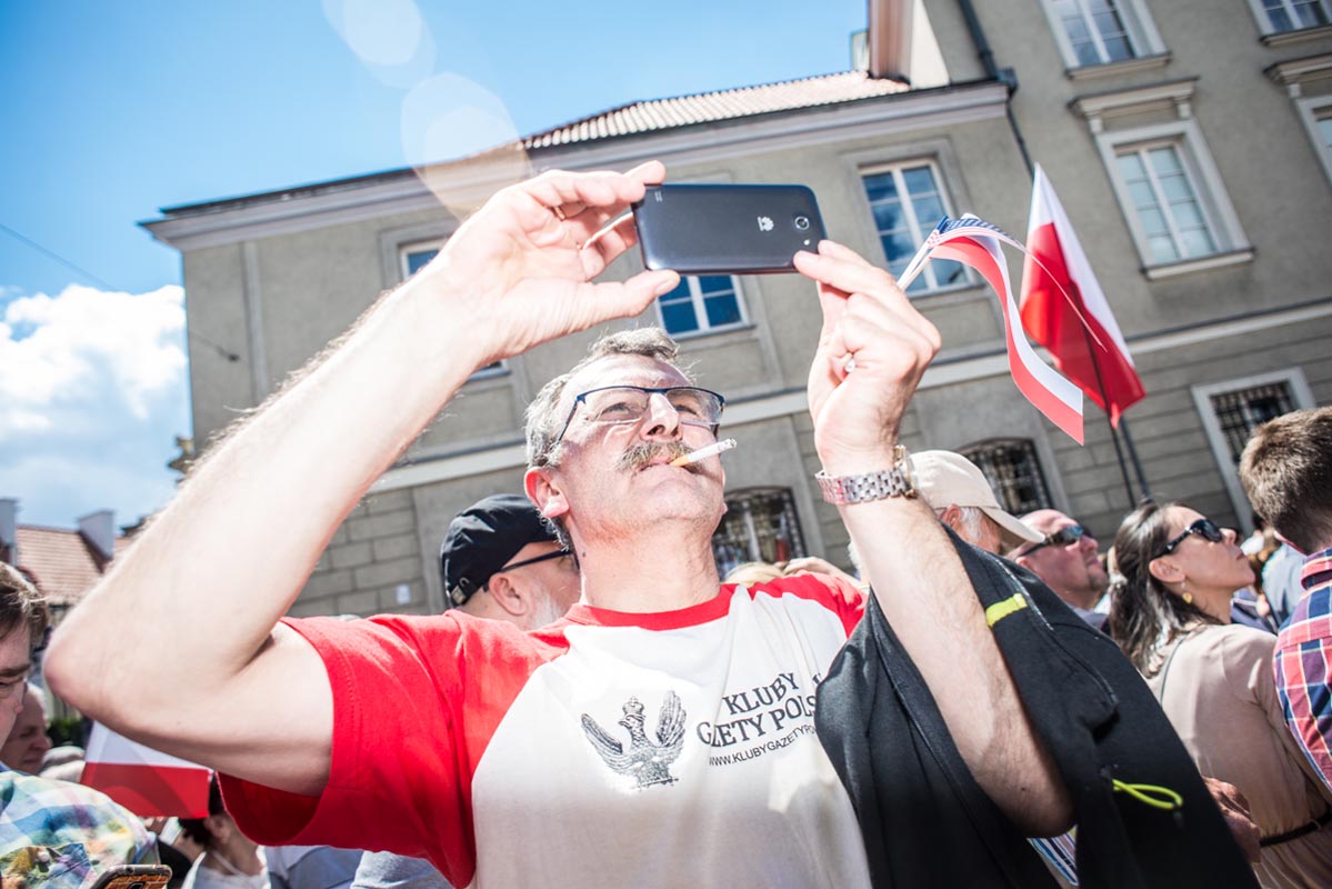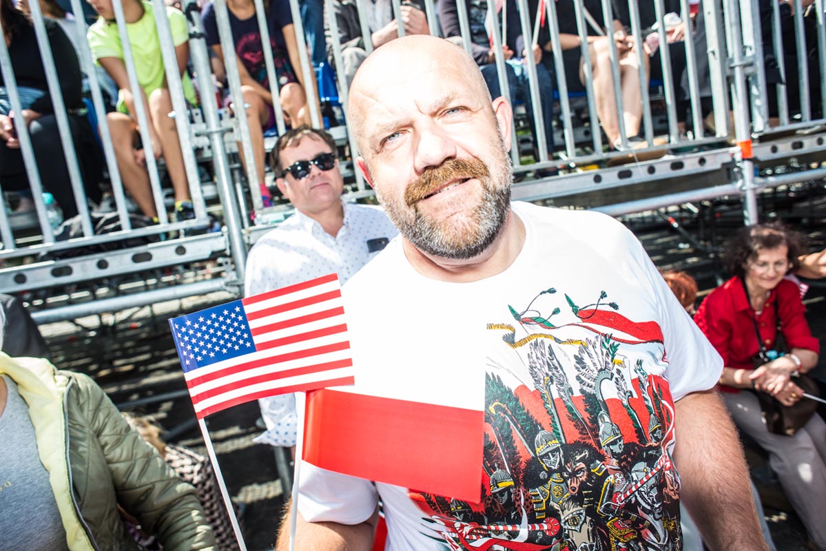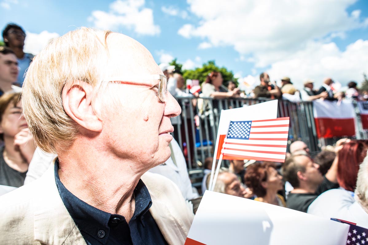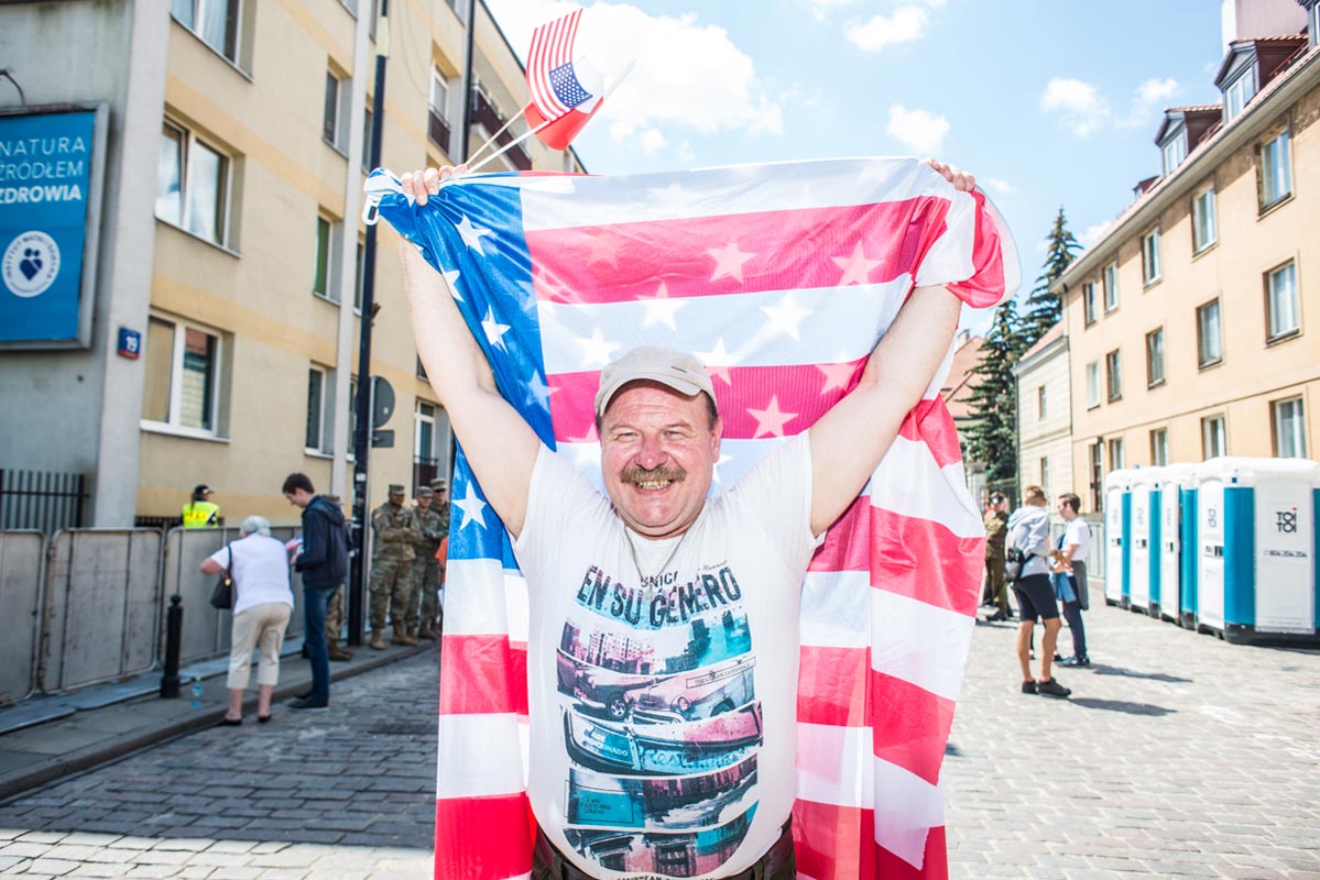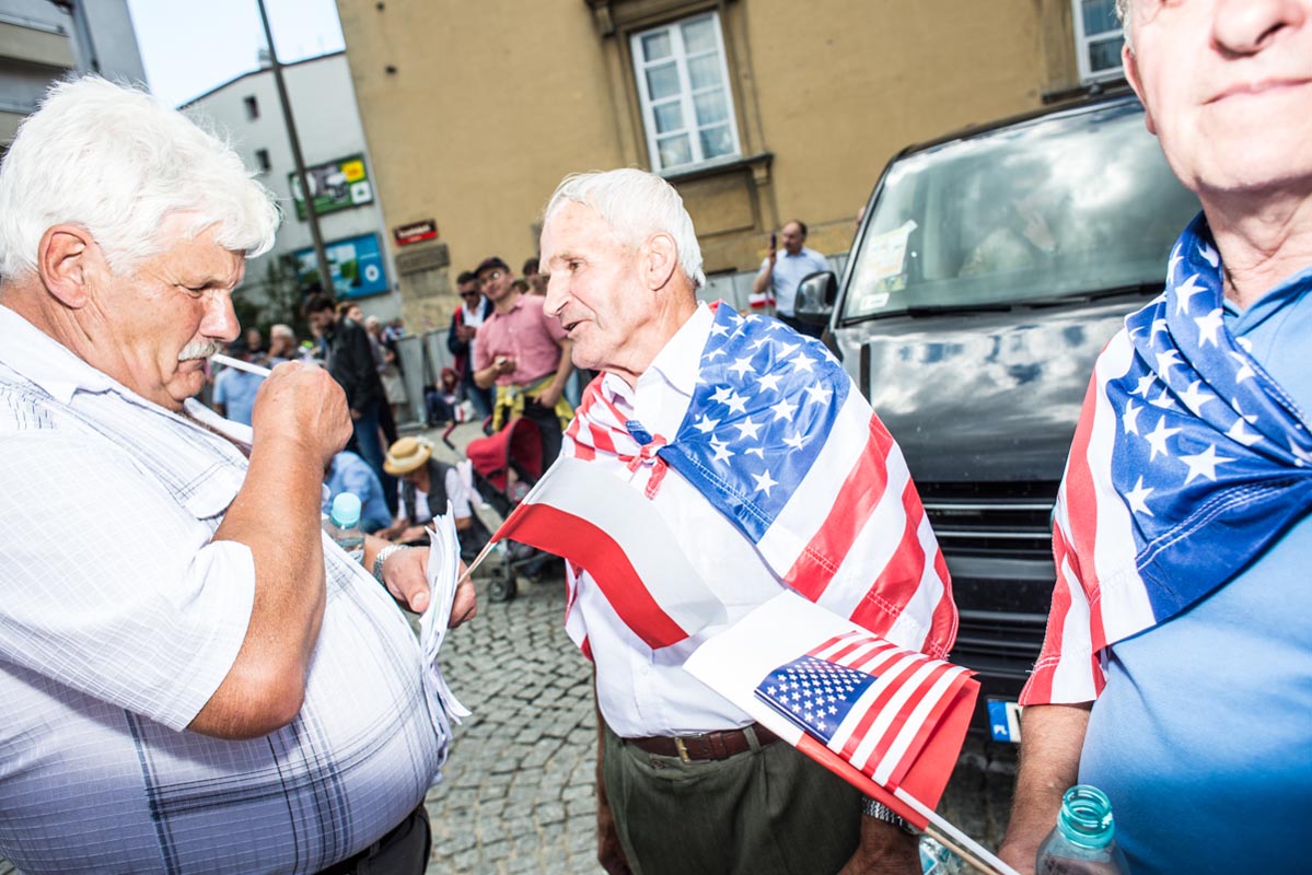 Chociaż tego typu zdjęcia to głównie portrety, nie wydaje mi się, by osobiście kogokolwiek ośmieszały. W każdym razie nie chciałbym, by tak było. Mam raczej nadzieję, że ośmieszają polityków, do których odwołują się bohaterowie i bohaterki zdjęć, oraz konwencję, którą oni sami sobie kreują. Żeby pozostać uczciwym wobec siebie i spotkanych podczas wizyty Donalda Trumpa na warszawskim placu Krasińskich osób, postanowiłem zrobić coś, czego z zasady nie robię. Wdawałem się z nimi w pogawędkę: prosiłem o możliwość zrobienia zdjęcia i pokazywałem jak wyszło. Zazwyczaj, jeśli ktoś odwraca twarz od obiektywu, to nie naciskam spustu migawki, a jeśli dana osoba nie protestuje, to traktuję to jako przyzwolenie. Tym razem zależało mi na realnej i szczerej przychylności opartej na uśmiechu, bo nie udawałem oczywiście, że kocham Trumpa. Nikt zresztą o to nie pytał.