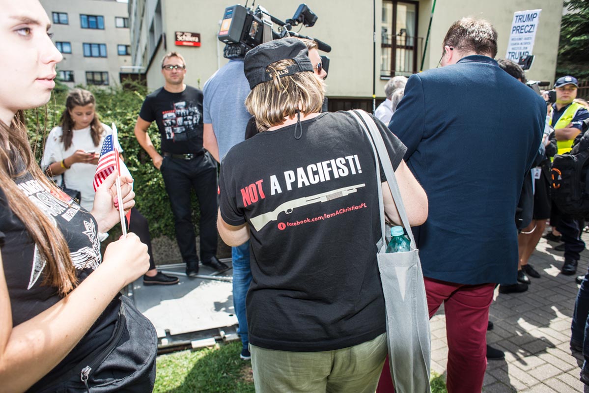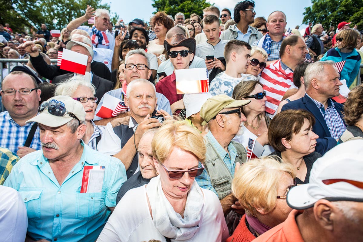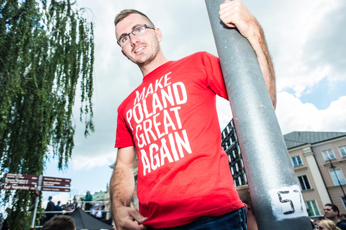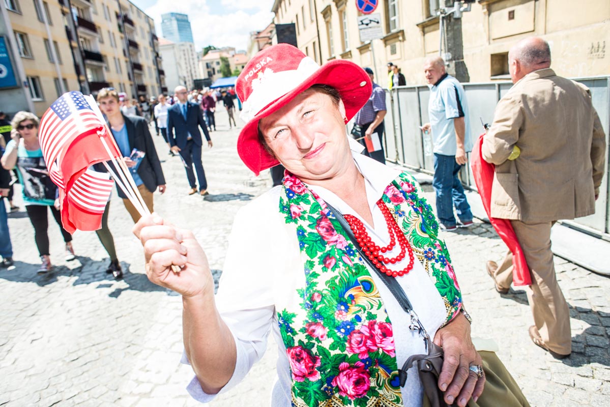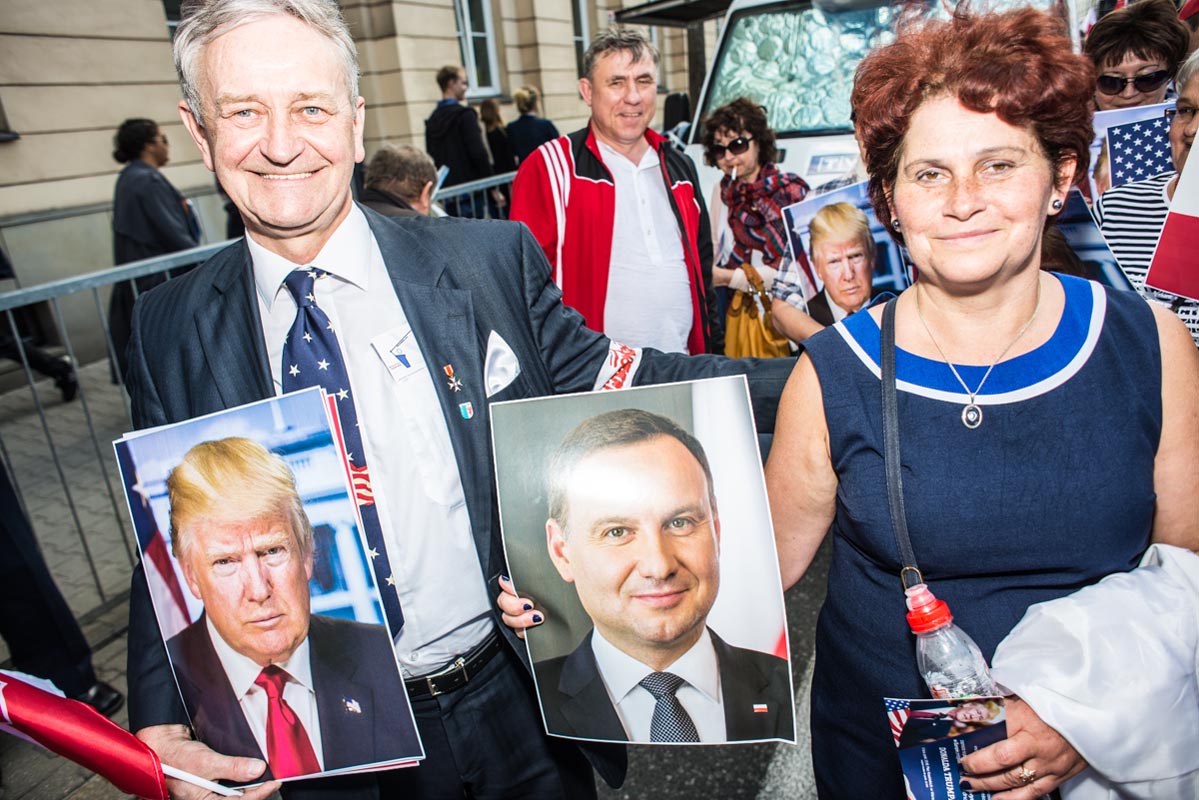 Chociaż tego typu zdjęcia to głównie portrety, nie wydaje mi się, by osobiście kogokolwiek ośmieszały. W każdym razie nie chciałbym, by tak było. Mam raczej nadzieję, że ośmieszają polityków, do których odwołują się bohaterowie i bohaterki zdjęć, oraz konwencję, którą oni sami sobie kreują. Żeby pozostać uczciwym wobec siebie i spotkanych podczas wizyty Donalda Trumpa na warszawskim placu Krasińskich osób, postanowiłem zrobić coś, czego z zasady nie robię. Wdawałem się z nimi w pogawędkę: prosiłem o możliwość zrobienia zdjęcia i pokazywałem jak wyszło. Zazwyczaj, jeśli ktoś odwraca twarz od obiektywu, to nie naciskam spustu migawki, a jeśli dana osoba nie protestuje, to traktuję to jako przyzwolenie. Tym razem zależało mi na realnej i szczerej przychylności opartej na uśmiechu, bo nie udawałem oczywiście, że kocham Trumpa. Nikt zresztą o to nie pytał.