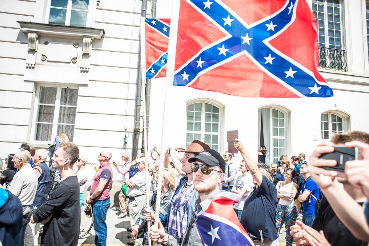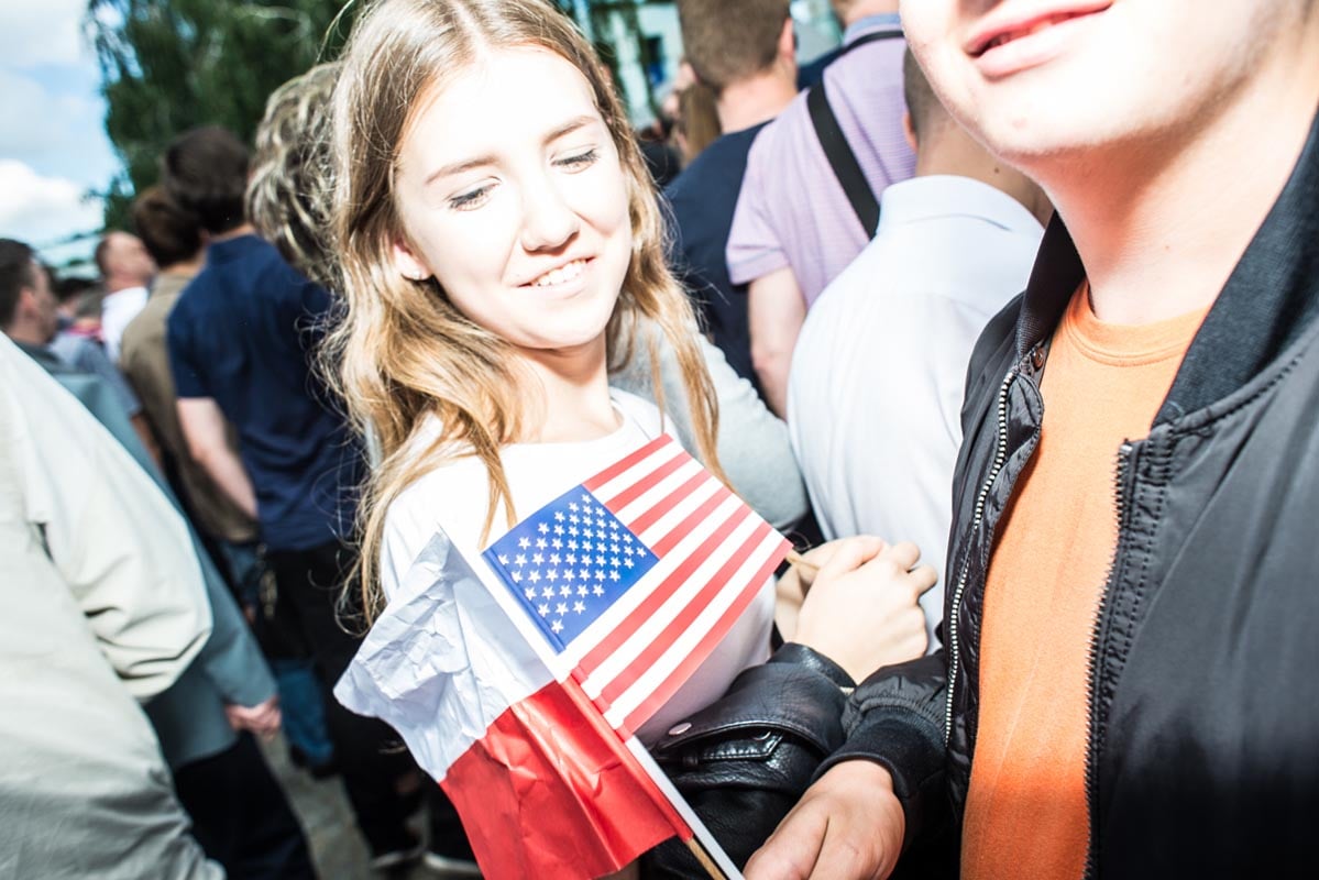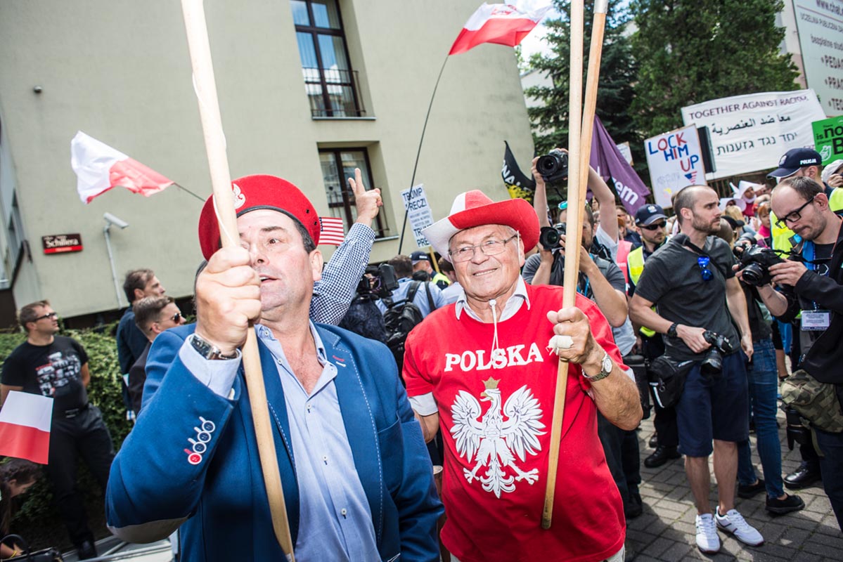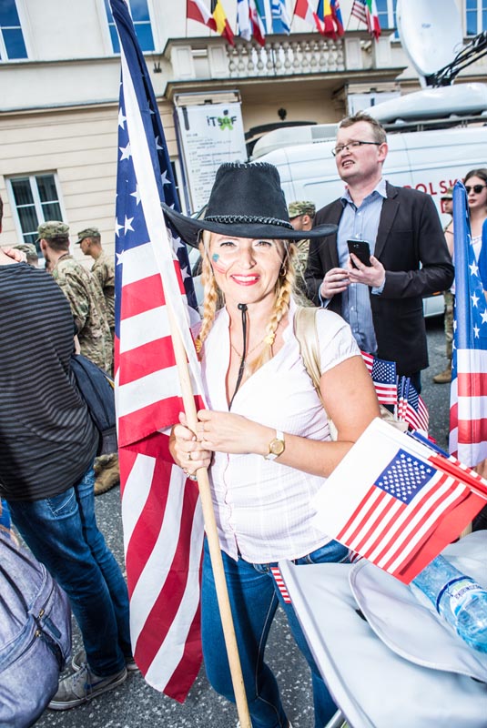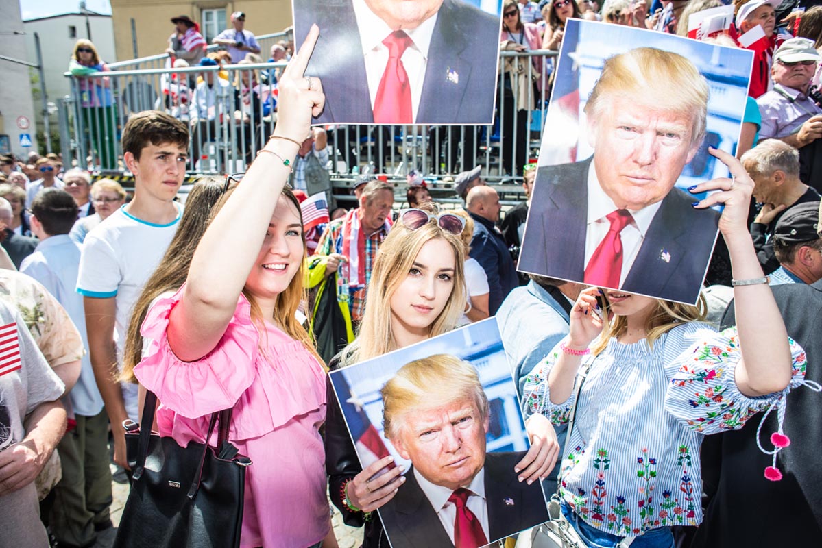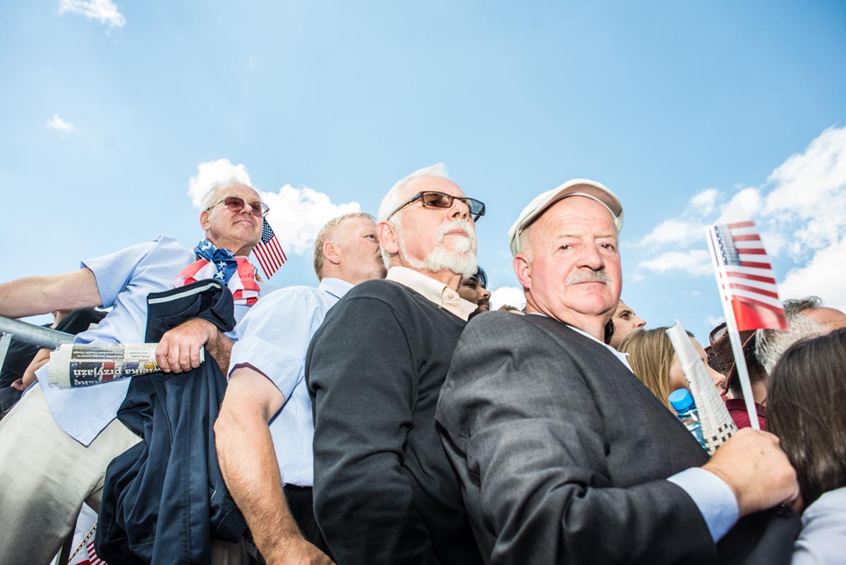 Chociaż tego typu zdjęcia to głównie portrety, nie wydaje mi się, by osobiście kogokolwiek ośmieszały. W każdym razie nie chciałbym, by tak było. Mam raczej nadzieję, że ośmieszają polityków, do których odwołują się bohaterowie i bohaterki zdjęć, oraz konwencję, którą oni sami sobie kreują. Żeby pozostać uczciwym wobec siebie i spotkanych podczas wizyty Donalda Trumpa na warszawskim placu Krasińskich osób, postanowiłem zrobić coś, czego z zasady nie robię. Wdawałem się z nimi w pogawędkę: prosiłem o możliwość zrobienia zdjęcia i pokazywałem jak wyszło. Zazwyczaj, jeśli ktoś odwraca twarz od obiektywu, to nie naciskam spustu migawki, a jeśli dana osoba nie protestuje, to traktuję to jako przyzwolenie. Tym razem zależało mi na realnej i szczerej przychylności opartej na uśmiechu, bo nie udawałem oczywiście, że kocham Trumpa. Nikt zresztą o to nie pytał.