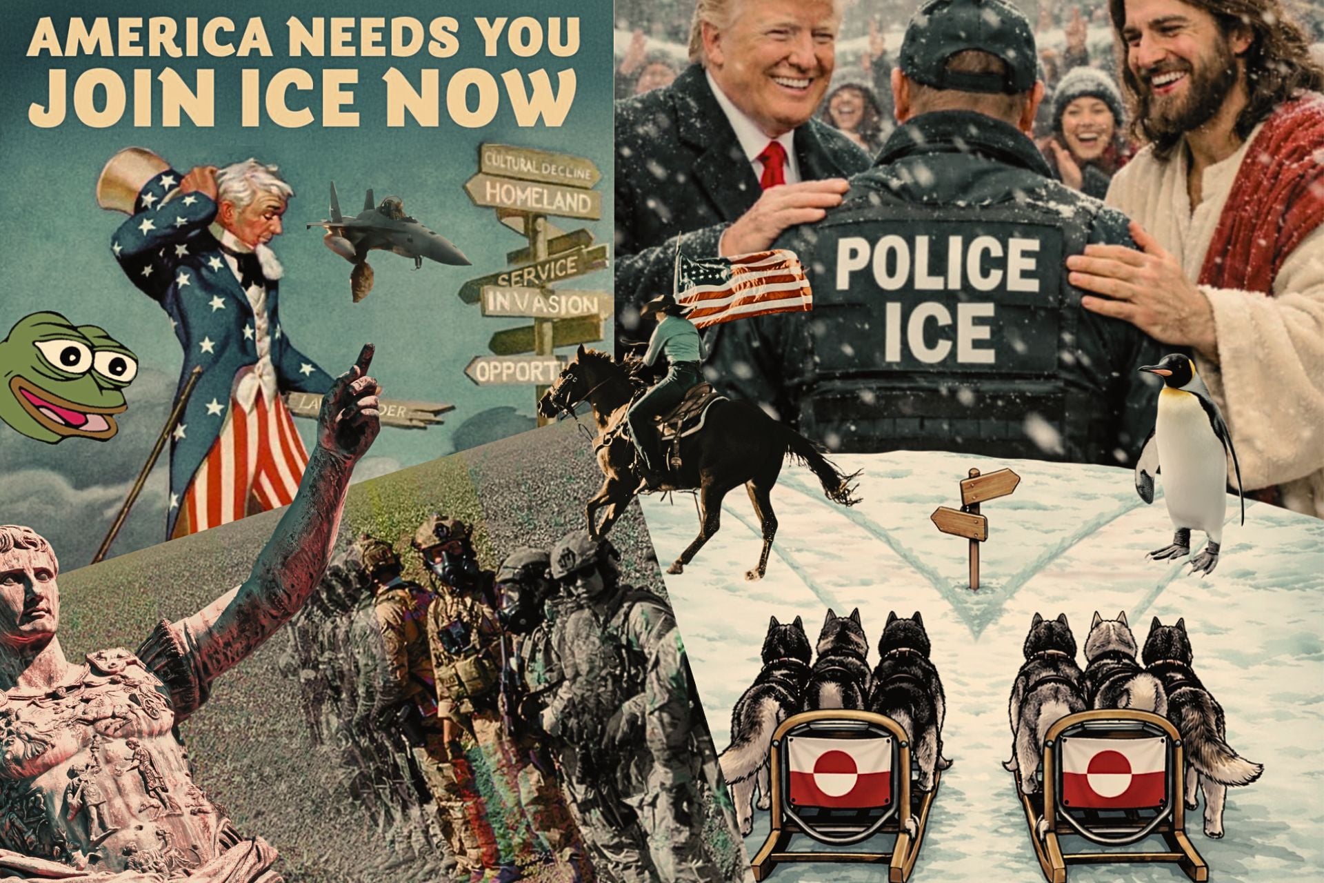Ten rodzaj komunikacji obecna administracja kieruje nie tylko do wewnątrz, ale i na zewnątrz. W trakcie szarży Trumpa w temacie Grenlandii na oficjalnym profilu Białego Domu pojawiła się grafika podpisana „którędy, Grenlandczyku?”, przedstawiająca dwie pary sań zaprzężonych w psy, przemierzające polarny krajobraz, udekorowane barwami z grenlandzkiej flagi. Sanie stoją na rozdrożu, jedna droga prowadzi do Białego Domu, druga do krajobrazu zdominowanego przez Kreml i flagę Chin. Po Davos, gdzie temat Grenlandii został chwilowo odwieszony na kołek, Biały Dom opublikował na X obrazek z Trumpem idącym w towarzystwie pingwina trzymającego amerykańską flagę w głąb arktycznego krajobrazu, w stronę, w którą patrzy widz.