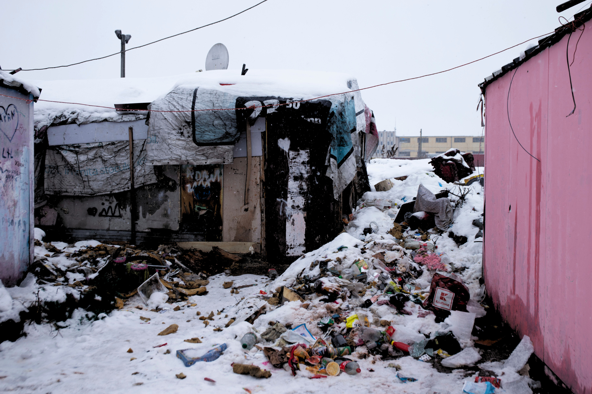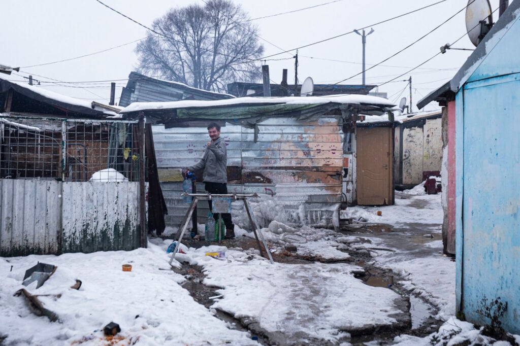 Kontrast ten nigdzie nie jest bardziej wyrazisty niż w slumsie Cantonului. Kluż-Napoka to austrowęgierskie kamieniczki, odśnieżone, szerokie chodniki, kawiarnie z menu dostępnym wyłącznie przez kod QR. Cantonului jest z kolei klaustrofobiczne, wciśnięte między ruchliwą ulicę po jednej stronie i tory po drugiej. Tworzą go małe domki, zlepione z byle jakich materiałów – pustaków, drewnianych palet, blachy – a pomiędzy nimi układają się wąskie korytarze. Trzeba bez przerwy patrzeć pod nogi, by nie wdepnąć w odchody bezpańskich psów, i w górę, by nie zahaczyć głową o przerzucone pomiędzy ścianami kable i sznury do rozwieszania prania. Z komunalnych kurków – mało kto ma w Pata-Rât własną łazienkę – woda leje się przy styczniowych temperaturach bez przerwy, inaczej zamarzają rury.